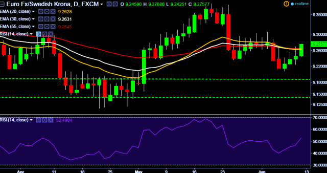 We prefer to take long position in EUR/SEK around 9.2720, stop loss 9.2329 and target of 9.2822/9.3039 marks.