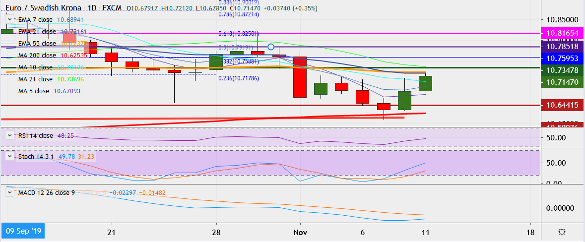 - Immediate resistance is located at 10.7240 (55-EMA), any close above could take it near 10.7418 (21-DMA).