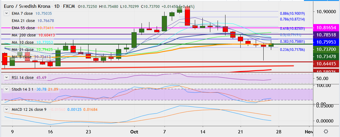 - EUR/SEK trades 0.1 percent up at 10.7374, having hit a low of 10.6497 the day before, its lowest since September 25.