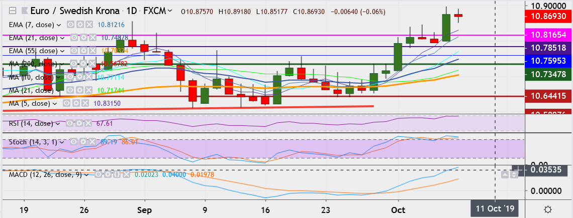 - EUR/SEK trades 0.1 percent down at 10.8685, having hit an all-time high of 10.8871 the day before.