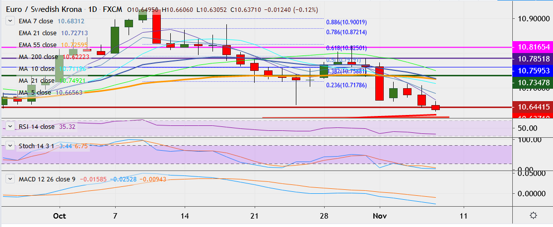 - EUR/SEK trades 0.1 percent down at 10.6362, having hit a low of 10.6305 earlier, its lowest since September 17.