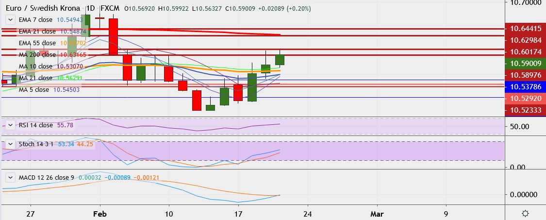 - EUR/SEK trades 0.3 percent up at 10.6002, having hit a high of 10.6125 on Thursday, its highest since February 4.