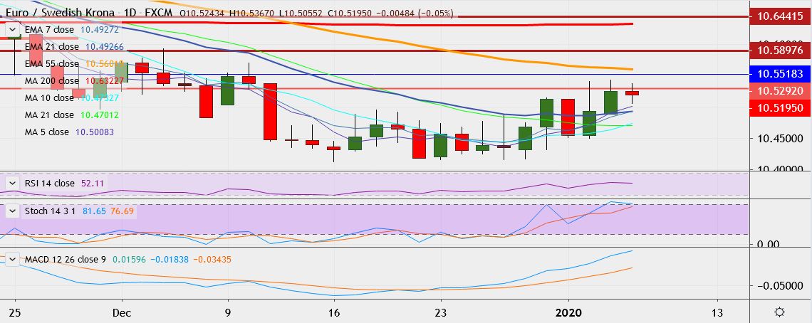 - EUR/SEK trades 0.1 percent down at 10.5055, having hit a high of 10.5430 on Monday, its highest since December 10.