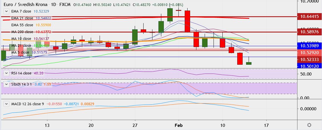 - EUR/SEK trades 0.1 percent up at 10.4832, having hit a low of 10.4741 on Wednesday, its lowest since January 3.