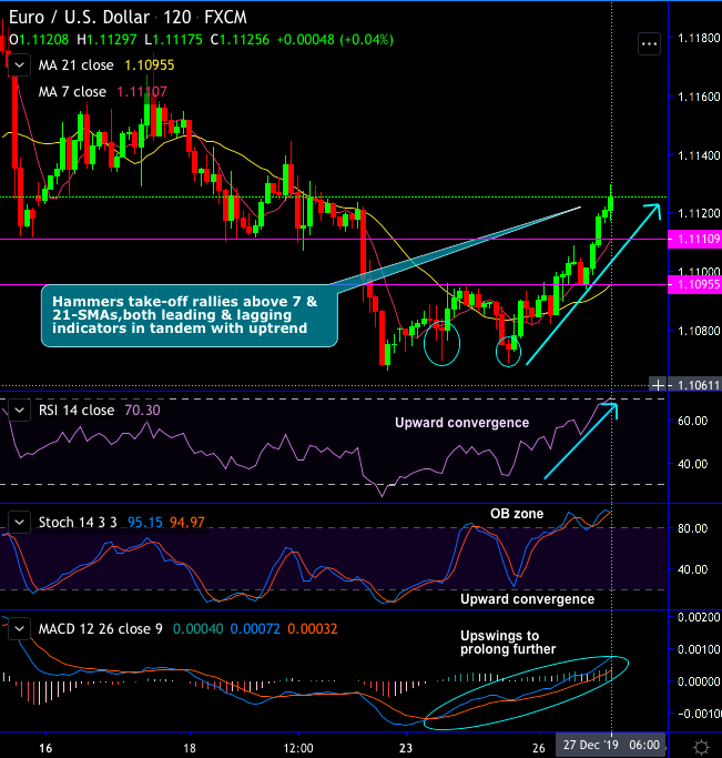 EURUSD short-term technicals are turning neutral to bullish. The pair has been attempting to bounce back from the recent past as the hammer patterns have taken-off rallies above 7 & 21-SMAs, as both leading & lagging indicators are in tandem with the uptrend (refer 2H chart).