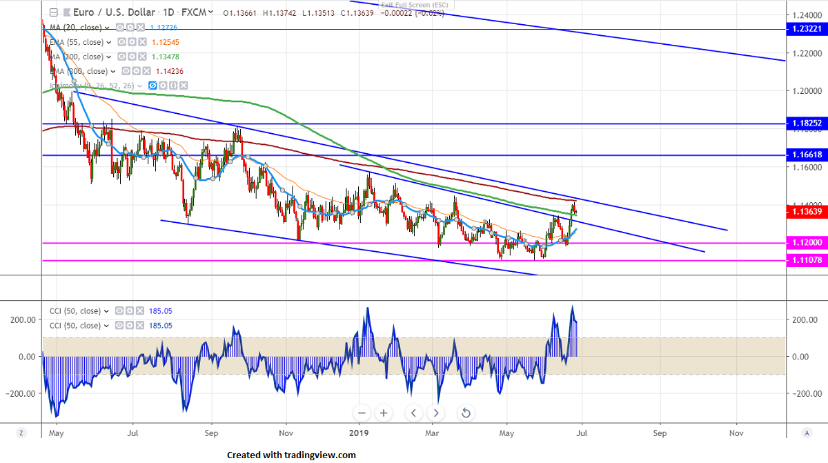 EURUSD has shown weakness after comments from Fed's Bullard and Chairman Powell on the rate cut. Federal Reserve Bank of St.Louis President James Bullard said that a lowering of the central bank's short-term rate target "may be warranted soon". The Fed chairman Powell failed to commit to easing. The pair declined temporarily till 1.13441 and is currently trading around 1.13613.