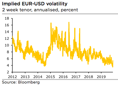 The prolonged low implied EURUSD volatility (refer above chart) indicates that the market still firmly believes that the introduction of tariffs planned for 15th December would be postponed. This optimism is no doubt admirable in view of the often rather volatile seeming nature of the US President and as the market was already caught by surprise and thus had been hit hard by Trump wielding the tariffs club in mid-2019.