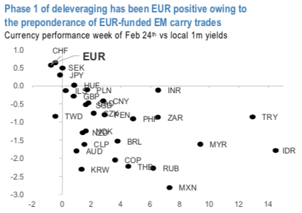 The timing of this downgrade might strike some as strange coming as it does on the heels of: 1) the Fed’s emergency rate cut (and the growing possibility that 85 the Fed could reach the zero-bound this year); and 2) the widespread deleveraging of EUR-funded carry