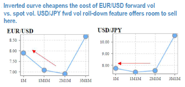 Spread structures, such as EURUSD - USDJPY 1M in 2M FVA spread, provide a further edge with its offsetting and thus low net decay characteristics that helped the fwd vol spread hold well over last couple of years. The spread structure should insulate and even benefit from potential downside pressure on preelection vols. With all eyes on EUR and expectations for muted yen spot action we think it worth to consider:- Long 1M in 2M (Sep 30 – Oct 30) EURUSD FVA @7.125/7.525indic vs short USDJPY FVA @7.3/7.7indicative. Courtesy: JPM