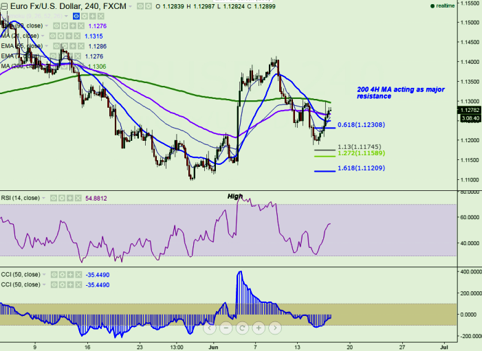 - EUR/USD has gained till 1.12987 yesterday after Fed kept its interest rates on hold. The pair is facing psychological resistance at 1.1300 (200 4 H MA) and is struggling to break above that level.