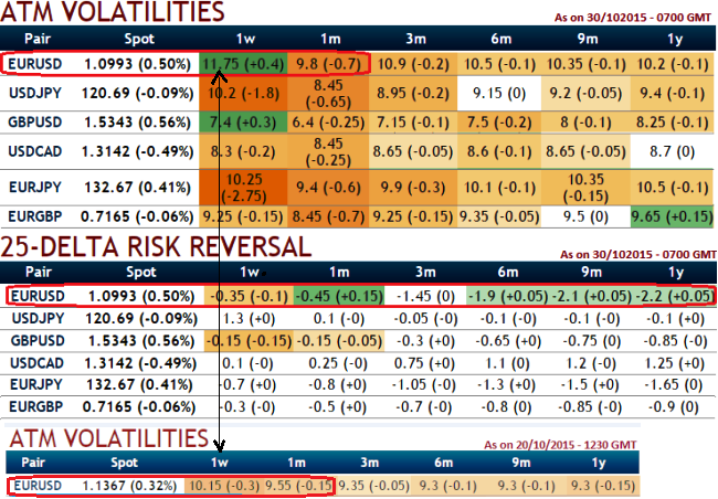 Please have a look at ATM vols and risk reversal nutshell from last week to the current situations. EURUSD still maintains the highest place for implied volatility of 1W at the money contracts among G7 currency space, almost nearing 12%, certainly rising higher which is favorable for those look for option writings.