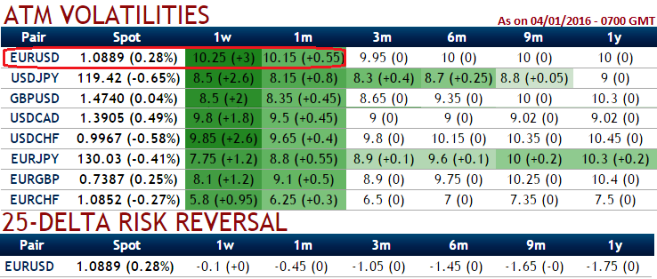 As you can observe from the table showing implied volatilities of ATM contracts (EURUSD of 1W-1M expiries show 10.25% and 10.15% that is the highest among G10 majors).