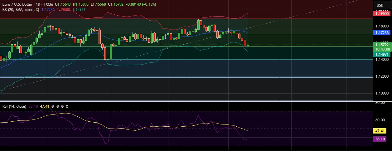 • Strong support is seen at 1.1555(38.2%fib) and break below could take the pair towards 1.496 (Lower BB).