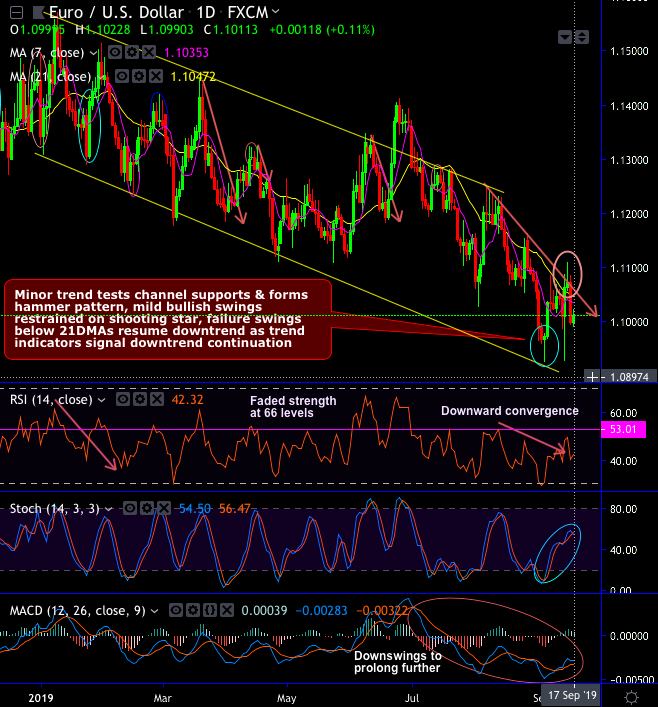 EURUSD’s both minor and major trends have been traveling through descending channels (observe daily and monthly plotting). Minor trend tests channel supports and forms hammer pattern at 1.0972 levels, mild bullish swings are restrained on shooting star formation at 1.1072 level. Since then the failure swings below 21DMAs resume downtrend as the trend indicators signal downtrend continuation (refer daily chart).