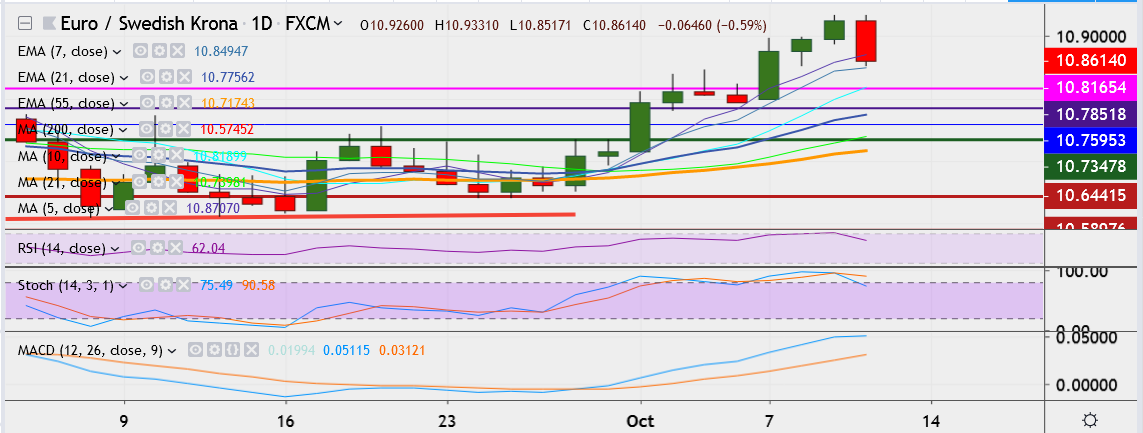 - EUR/SEK trades 0.6 percent down at 10.8605, having hit a all-time high of 10.9333 the day before.
