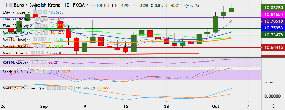 - The pair broke above the 10.8373 level and is drifting closer towards all-time peak 10.8554 hit in August.