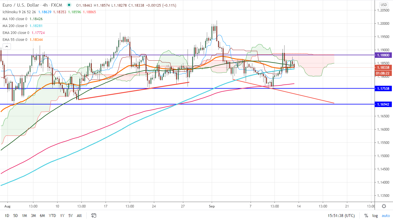 The 4-hour chart shows that the pair is trading slightly above 100 and 200 MA at 1.18275 and any break above 1.18750 targets 1.19250/1.2000.