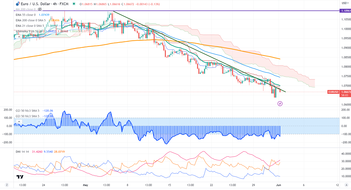 EURUSD showed a minor pullback on strong market sentiment. The US House of Representatives voted yesterday to raise the debt ceiling limit to avoid default. It hits a high of 1.07052 yesterday and is currently trading around 1.06656.