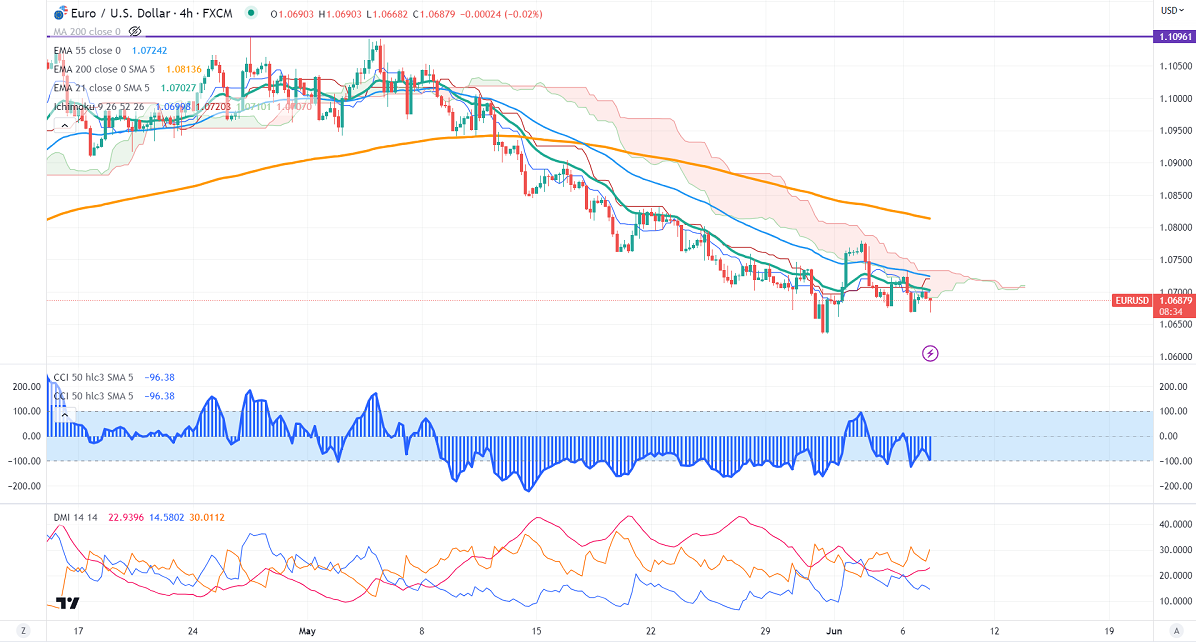 The pair trades below short-term 21 EMA, 55 EMA, and long-term (200-EMA) in the 4-hour chart. Any indicative break below 1.0660 confirms intraday bearishness; a dip to 1.0600/1.0570/1.0500 is possible. The near-term resistance is around 1.0720. The breach above targets 1.0780/1.0800/1.0865/1.0900.
