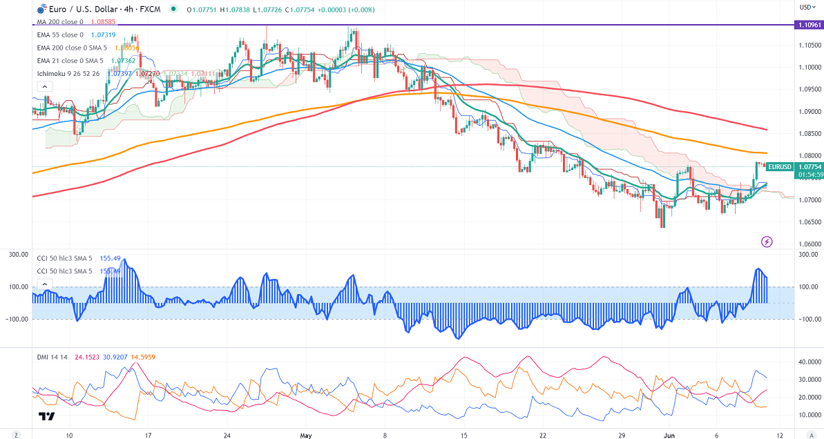EURUSD showed a nice pullback on board-based US dollar selling. The US dollar index lost momentum after weak jobs data. The number of people who have filed rose by 28000 to 261000 in the week ending June 3, the highest level since Oct 2021. It hits an intraday low of 1.07871 and is currently trading around 1.07782.