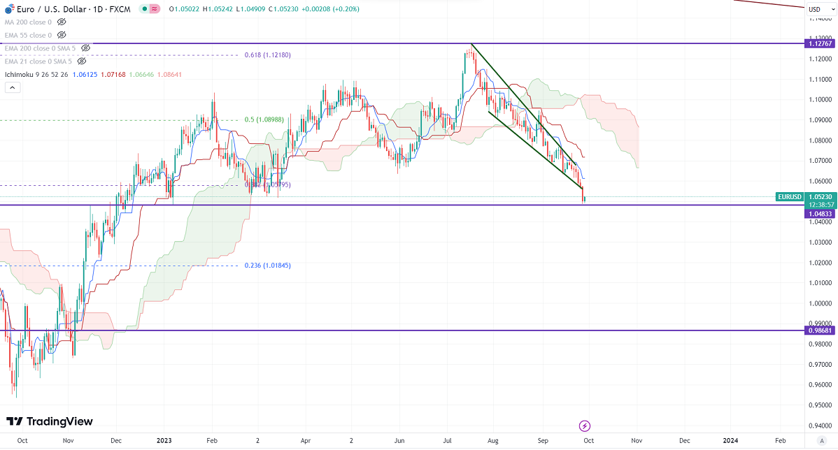 EURUSD declined sharply and hit a month low on the strong US dollar. It hit a low of 1.05559 and is currently trading around 1.05650.