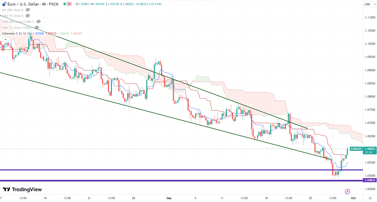 The pair trades above short-term 21 EMA, below 55 EMA, and long-term (200-EMA) in the 4-hour chart. Any break above 1.06100 confirms further bullishness. A jump to 1.0660/1.0700 is possible. The near-term support is around 1.05600, and any breach below targets 1.0500/1.04800.