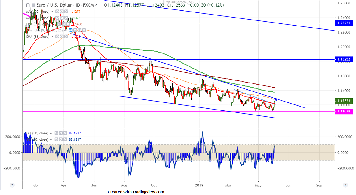 EURUSD trades higher for 3rd consecutive day and jumped more than 130 pips on account of declining US yield. US 10 year yield is trading lower and hits fresh 21-month low at 2.05%. The yield curve inverted which signals recession. The spread between 3 month yield and 10 year yield has widened from 10 basis point to 25 basis point. US ISM manufacturing came at 52.1 less than forecast of 53 lowest level in 31 months. The pair hits high of 1.12620 and is currently trading around 1.12538.