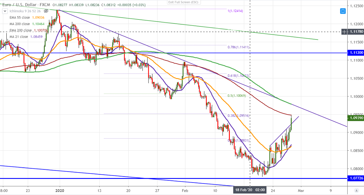 EURUSD trading higher for the past 4 days and hits 2-week high amid coronavirus. The coronavirus has spread to all countries especially South Korea, Italy is the worst-hit next to China. It hits a high of 1.09461 at the time of writing and is currently trading around 1.09443.