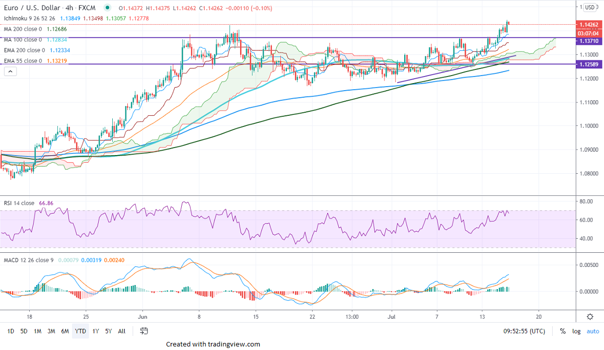 EURUSD is trading higher for 4th consecutive days and jumped more than 150 pips. It hits the highest level since Jun on COVID-19 vaccine optimism. The Moderna Phase 1 trial results showed that the vaccine is safe and expected to start the Phase 3 trial on Jul 27th. But the rise in the number of new coronavirus cases and uncertainty about the EU fund might cap huge gains. It is currently trading around 1.14270.