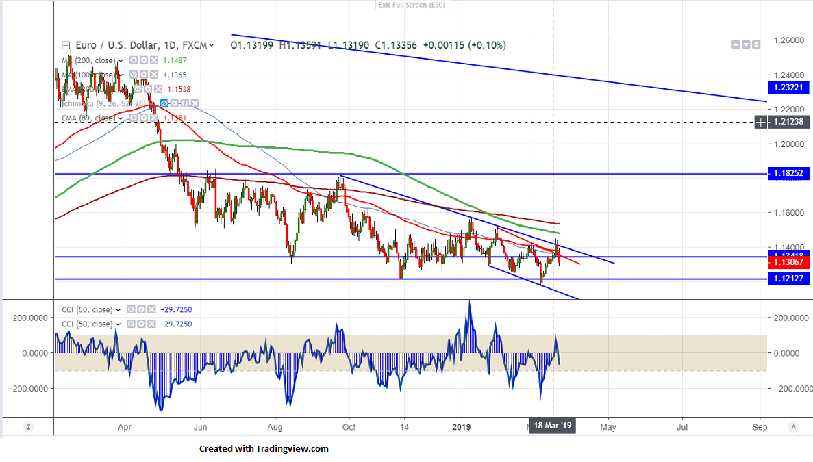 EURUSD was trading higher after dovish Fed and jumped till 1.14482 on Mar 20th 2019. The pair pared its gain after release of French and German PMI data. German flash manufacturing PMI came at 44.7 in Feb compared to forecast of 48 and services PMI came slightly above expectations at 54.9 vs estimate of 54.8. The pair lost nearly 100 pips and hits intraday low of 1.12883 and is currently trading around 1.13069.