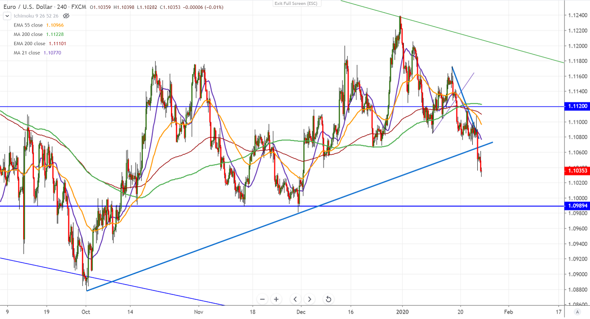EURUSD declines once again after a minor jump till 1.10617 after the release of Purchase Manufacturing Index data. German Manufacturing PMI came at 45.2 in Jan vs forecast of 44.5, while services PMI stands at 54.2 in Jan vs 52.9 expected. The pair hit 7-week low yesterday after ECB President said in the press conference that chances of downside risks in Eurozone growth are high. It has tumbled to a low of 1.10282 at the time of writing and is currently trading around 1.10365.