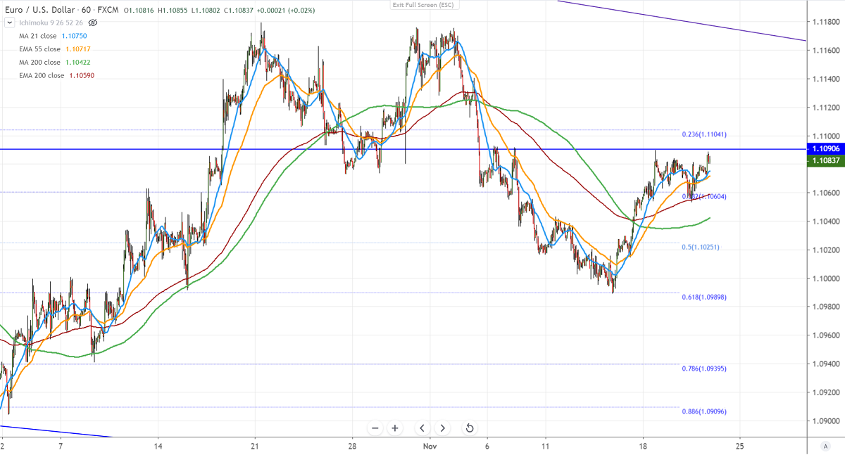 EURUSD is on the upward trend from Nov 14th and jumped more than 100 pips till 1.10899. The Fed minutes clearly said that the current policy "likely would remain so long as incoming information about the economy did not result in a material reassessment of the economic outlook,". Most of the Fed policymakers see no need for a further rate cut in the coming months. It hits an intraday high of 1.10888 and is currently trading around 1.10834.