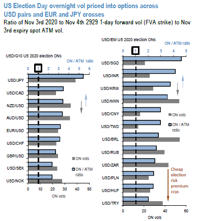 While delays in getting the results are atypical for the US elections, the fluid COVID-19 backdrop and reliance to a larger degree than in the past on mail-in voting carries some risks which wider spanning calendars would be effective in hedging. Taking USDJPY vols as an illustrative example in 2nd chart we note that USDJPY implied 1M fwd vols are showing a typical cliff-edge post-election roll-off on order of 3vol pts (from 10.5 down to 7.5vols).