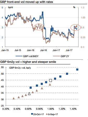 History suggests that the back-up in GBP 2y swap rates comes ahead of the first hike and that there is some stability thereafter. The swaption market allows expressing this view in a leveraged way, benefiting from the recent spike in GBP short rates vol (refer above graph) and from the steep smile (refer above graph). Both of these trades deliver maximum profits if the 2y rate is around (but below) its 6m forward rate in 6m time. Courtesy: SG