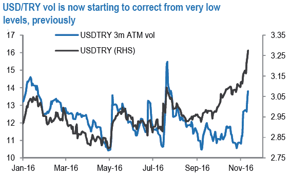 We find option exposure most attractive at present, with implied volatility and skew trading near their lowest levels in a year when we entered our USDTRY call on 7th November. USDTRY vol has recently spiked higher following the global risk-off after the US election results, (see above chart).