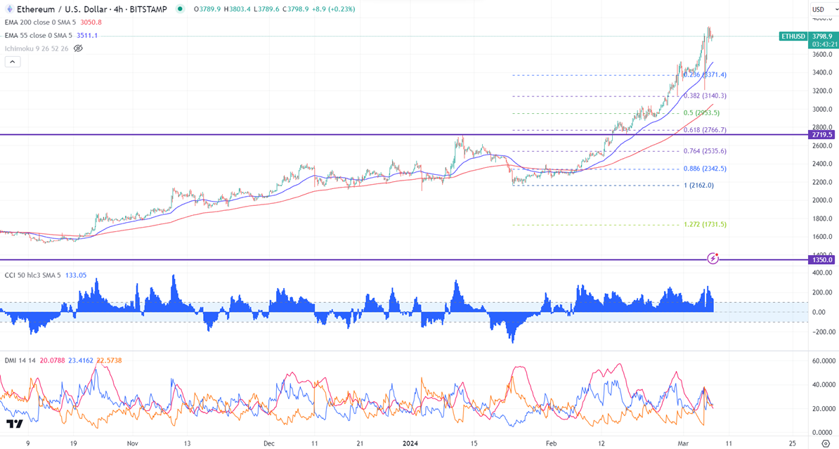 ETHUSD hits fresh year high ahead of Dencun upgrade. It hit a high of $3900 yesterday and is currently trading around $3797.