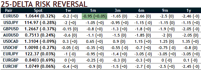 Negative flashes delta risk reversals would imply the mounting hedging sentiments in the bearish trend of the pair. The hedging position for euro crosses is naturally long vega on the downside and short on the topside, fitting with the volatility market dynamics (see nutshell showing IVs and RR). Hence, 3m risk reversals of euro crosses. Stay short in 3m EURCHF vanilla option structures (bearish at levels 1.0840 months ago), marked at -0.35%.