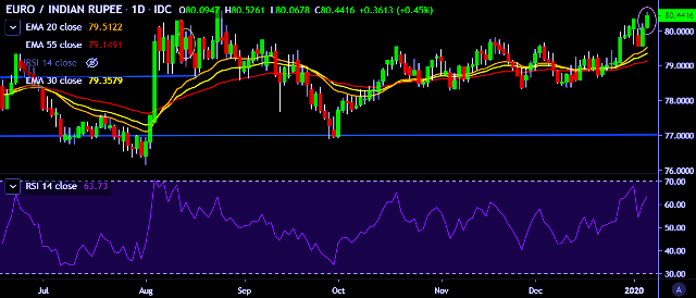 We prefer to go long on EUR/INR around 80.40, stop loss at 80.00 and target of 80.86/81.17.