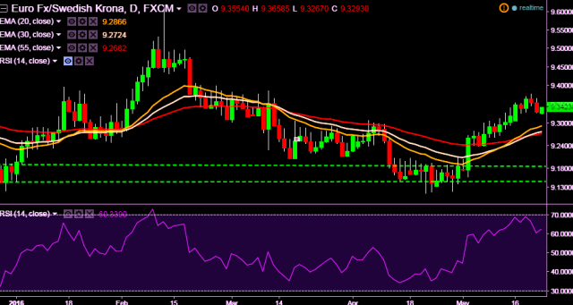 We prefer to take long position in EUR/SEK around 9.3380, stop loss 9.3225 and target 9.3658/ 9.3781 marks.