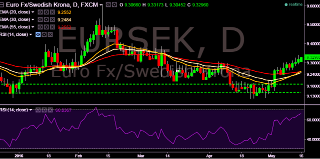 We prefer to take long position in EUR/SEK around 9.3200, stop loss 9.2920 and target 9.3495.