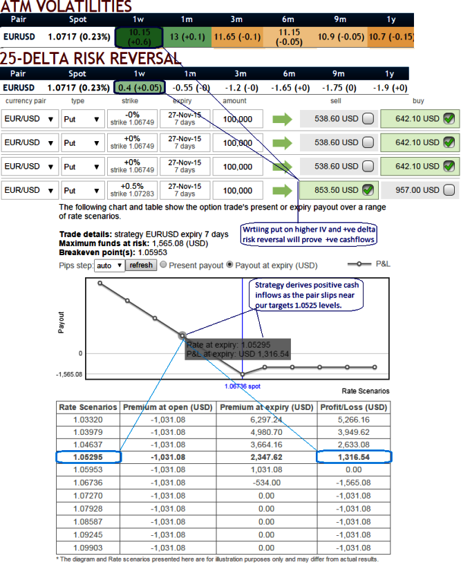 Contemplating the above risk reversal computations and Capitalizing on higher IV, we eye on shorting (1%) 1w in the money put (this would match 1w risk reversals) which would lock in certain yields by initial receipts of premiums.