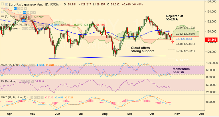- EUR/JPY trades with a bearish bias on the daily charts. Cloud offers support at 128.44. Break below to see further weakness.