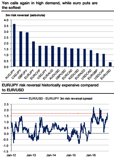 The spread between EURJPY and EURUSD 3m risk reversals is now very elevated historically, as it is exceeding 1.5 vols (see above graphs).