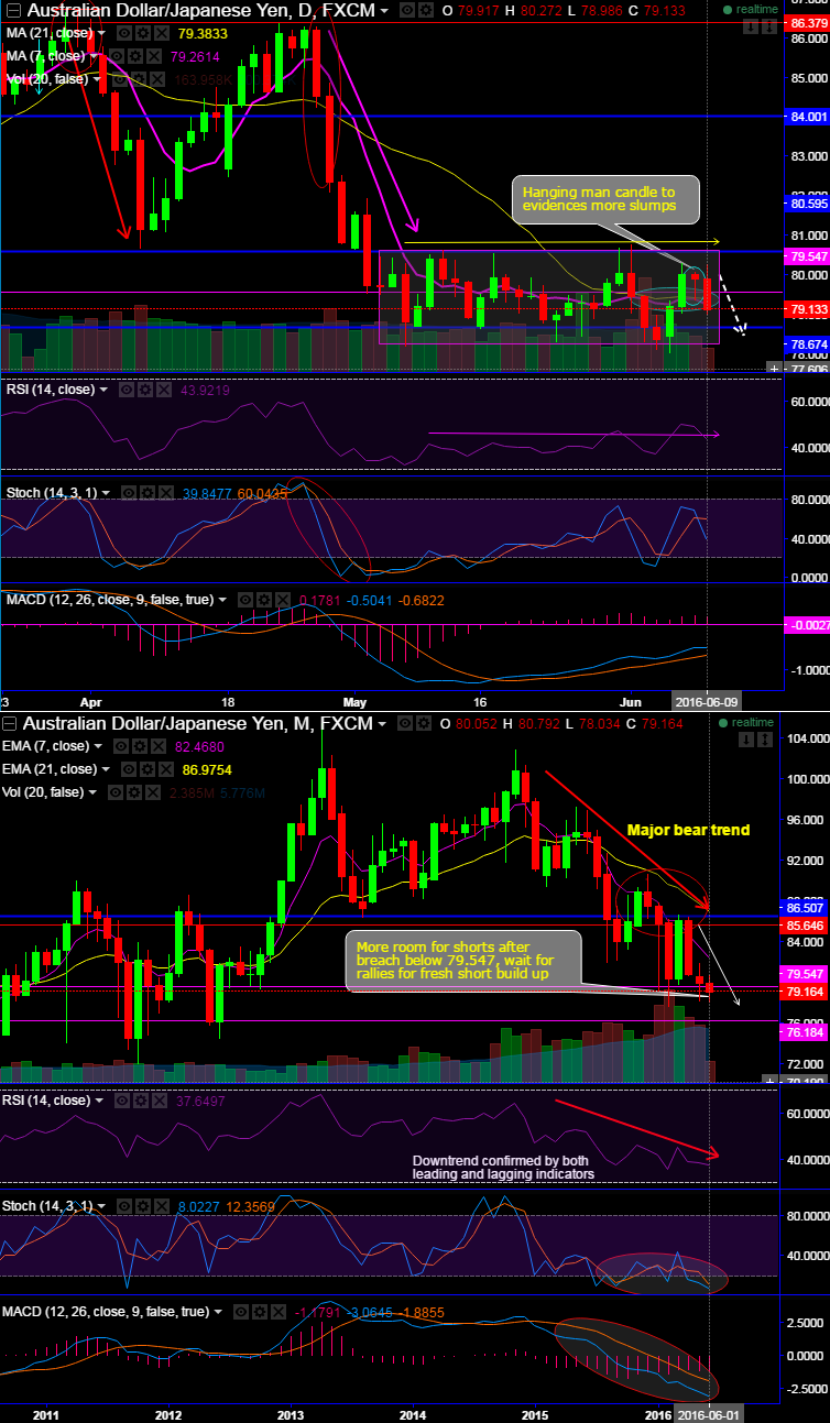 During abrupt rallies of AUDJPY as stated in our previous write up, the interim bulls seem to have given up and bears have been alert to pull back at the strong resistance of 80.595 on daily charts that is where a hanging man pattern candle is occurred at 79.917 levels.