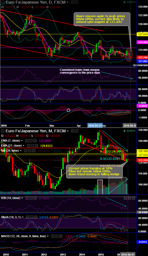 This month, the pair tested supported near 122.028 levels (Wedge base & 50% Fibo levels) but we could now foresee all chances of failure swings and break below these levels.