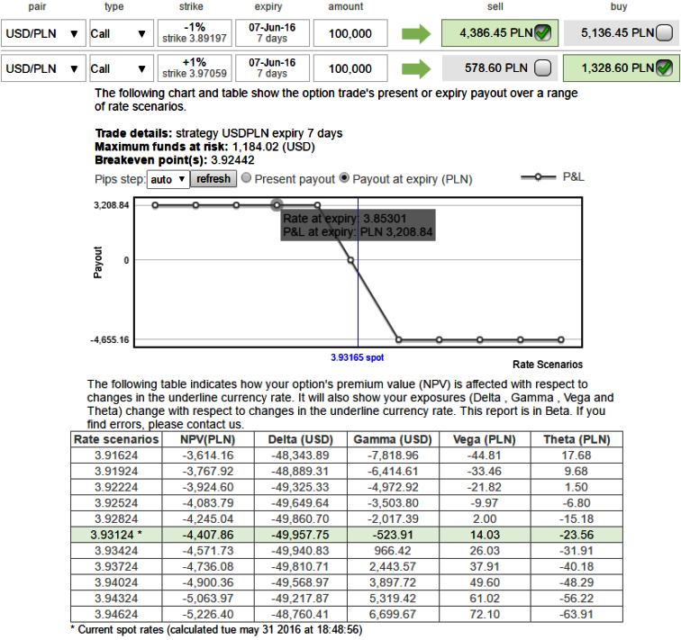 Thereby, you are speculating the USDPLN's struggle in short run by shorting, and hedge any dramatic upside risks in long term via longs in OTM strikes which is why we've used diagonal expiries.