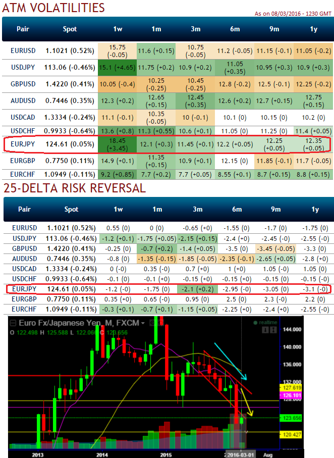 Despite acknowledging the recent uptick in the implied volatility of Euro crosses, especially EURJPY with higher negative risk reversal is justifiable when you have to observe the spot curve of this pair (see IV and RR nutshell and compare this with spot prices).
