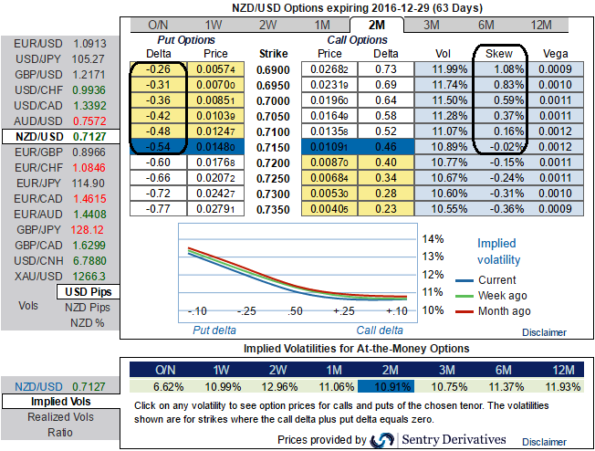 Rationale: Unlimited downside and limited upside profit potential and higher IVs favor option holders. Fundamentally, RBNZ is likely to ease in its monetary policy with 25 bps to keep OCR at 1.75% on November 10th, while FED rate hikes during Christmas also seems to be most likely event, moreover, Fed official signaling the further hikes in 2017 is an added pressures to NZDUSD.