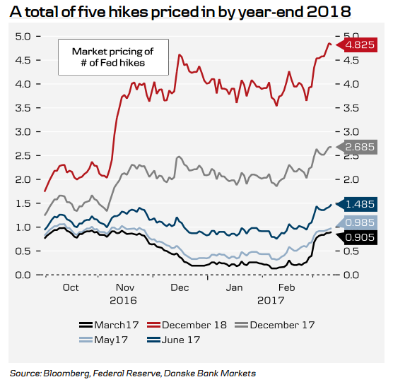 "We expect the Fed to hike three times this year (March, July and December). We think the Fed will begin the reduction in Q1 18. An NY Fed survey shows that primary dealers expect it to begin a bit later in mid-2018," said Danske Bank in a report.