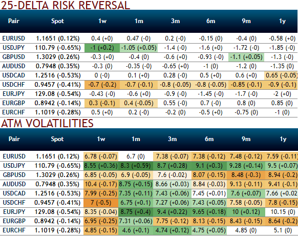 Please be noted that despite above-mentioned data events, EURUSD IVs are shrinking away with neutral shifts in risk reversals, while 1-3m RR has currently turned into positive flashes to mitigate bullish risk sentiments, while the 3m and 1y are lower than one vol for EUR puts. Crossing the line whereby euro calls become more expensive than puts may not be that far away. While the positively skewed IVs of 1m tenors signify upside risks of the underlying pair.
